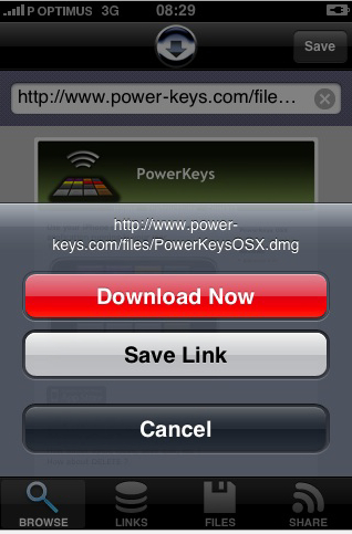 Una volta avviata l’applicazione dovremo inserire il link esatto del file che intendiamo scaricare oppure usare il mini-browser integrato in iDownload per navigare tra le pagine web e trovare ciò che desideriamo (.mp3, .avi, .png, .jpg, ecc…).